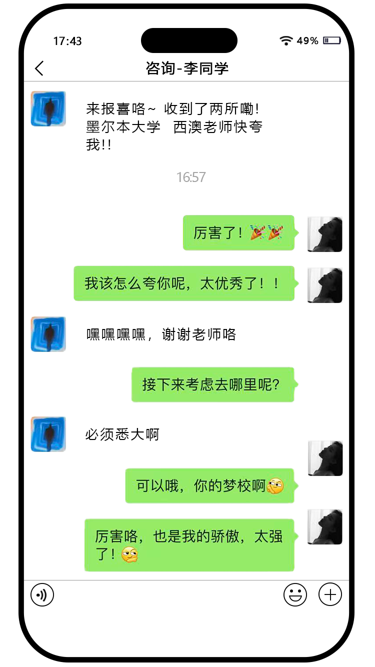 李同学在英国本科就读不顺利,回国工作需要名校学历,通过我们的澳洲保录取项目,成功进入墨尔本大学经济学专业就读。